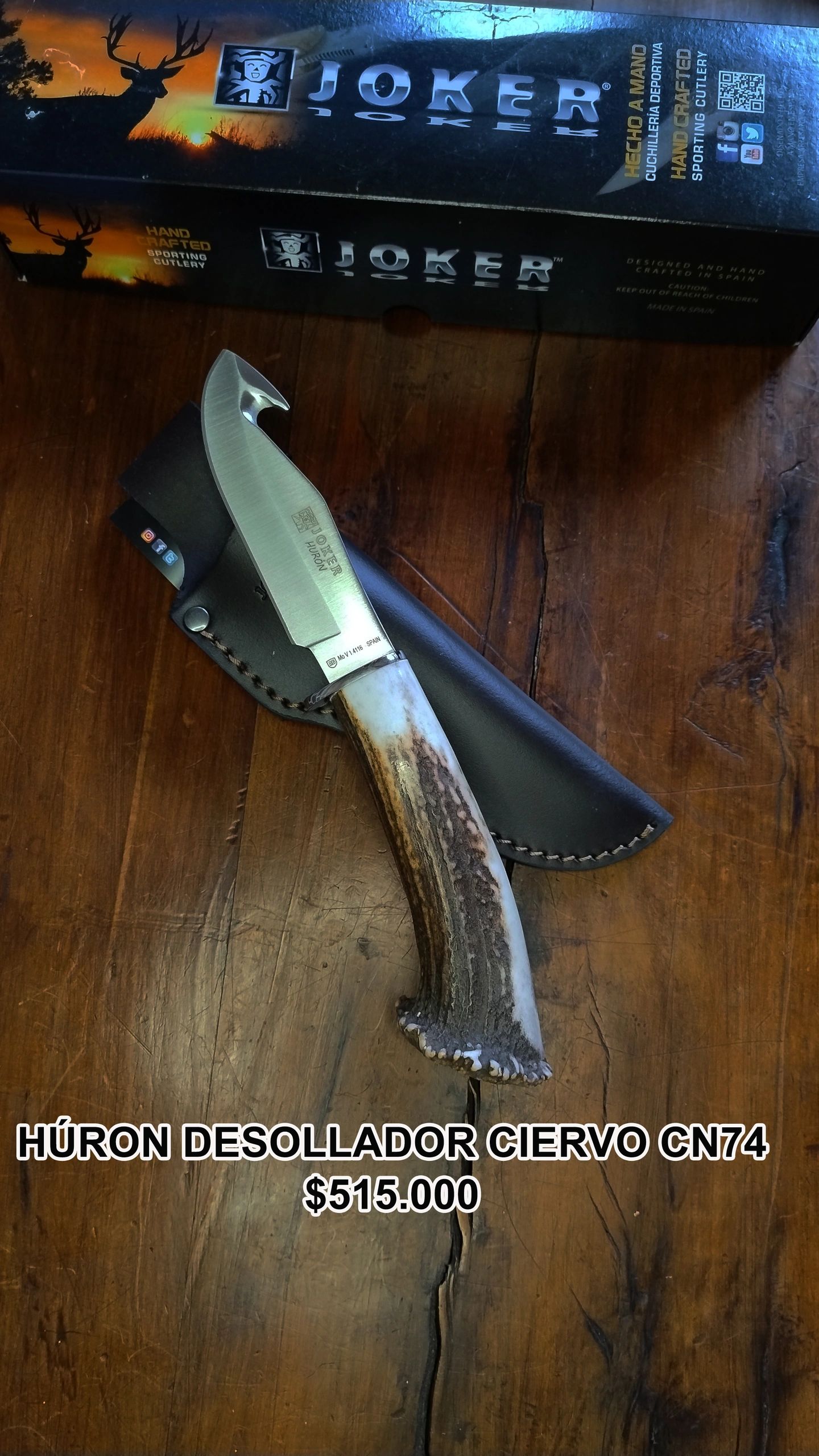 El Cuchillo de Caza Joker Hurón ha sido fabricado bajo la Denominacion de Origen de Albacete (España). Se trata de un cuchillo deportivo perfecto para tus lances de caza, específicamente para desollar. El Cuchillo desollador Joker Hurón es de hoja de espiga fabricado en acero inoxidable Mova 1.4116 con un largo de hoja de 11 cm, ancho de pala de 2,7 cm y un grosor de 3,5 mm. El largo del mango es de 12 cm y está fabricado en asta de ciervo. El cuchillo Joker Hurón viene acompañado de una funda d