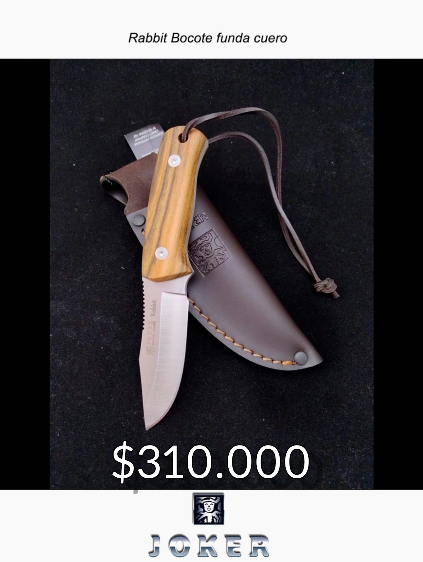 El Cuchillo Joker Rabbit es una herramienta compacta y versátil, ideal para bushcraft, caza menor y actividades outdoor. Con una hoja enteriza de acero inoxidable Molibdeno Vanadio de 8,5 cm, mango de madera de bocote de 8,9 cm y funda de cuero, ofrece precisión, resistencia y elegancia. Su diseño Drop Point, peso ligero de 130 g y fabricación artesanal en Albacete lo convierten en una opción práctica y duradera para cualquier aventura.