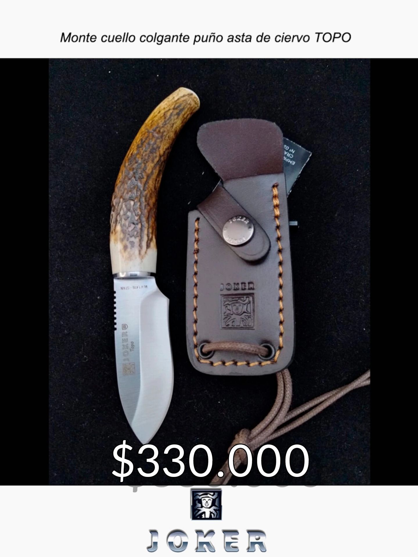 CC57 Cuchillo de caza y monte con colgante de Joker, hoja de acero molibdeno vanadio, mango de asta de ciervo, tamaño hoja 7,5 cm, peso 81 gr, incluye funda de cuero.