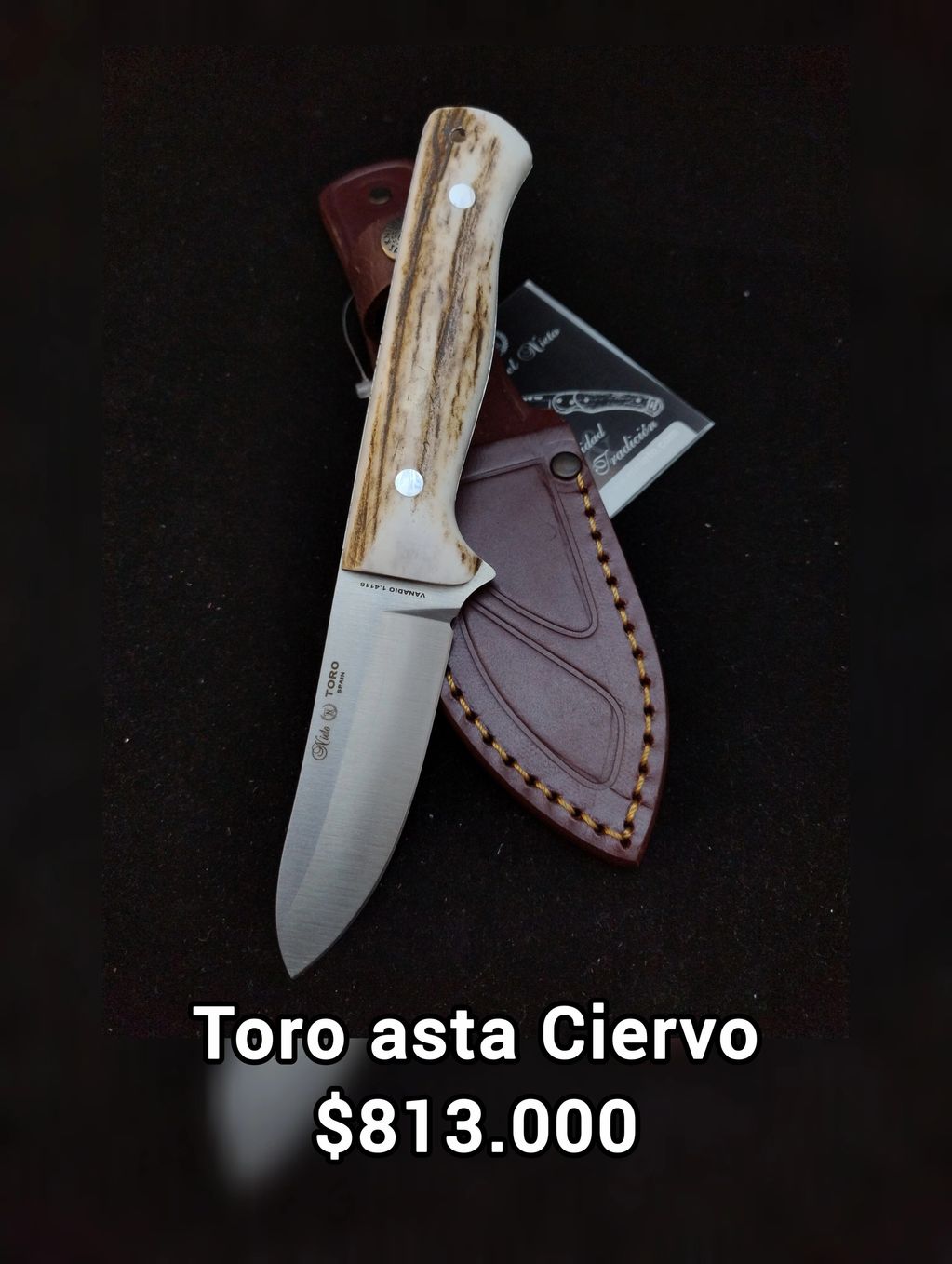 Hoja Acero AN-58 Mango Asta de ciervo Tamaño hoja8,5 cm Tamaño19 cm Peso140 gr Funda Piel de primera calidad marrón