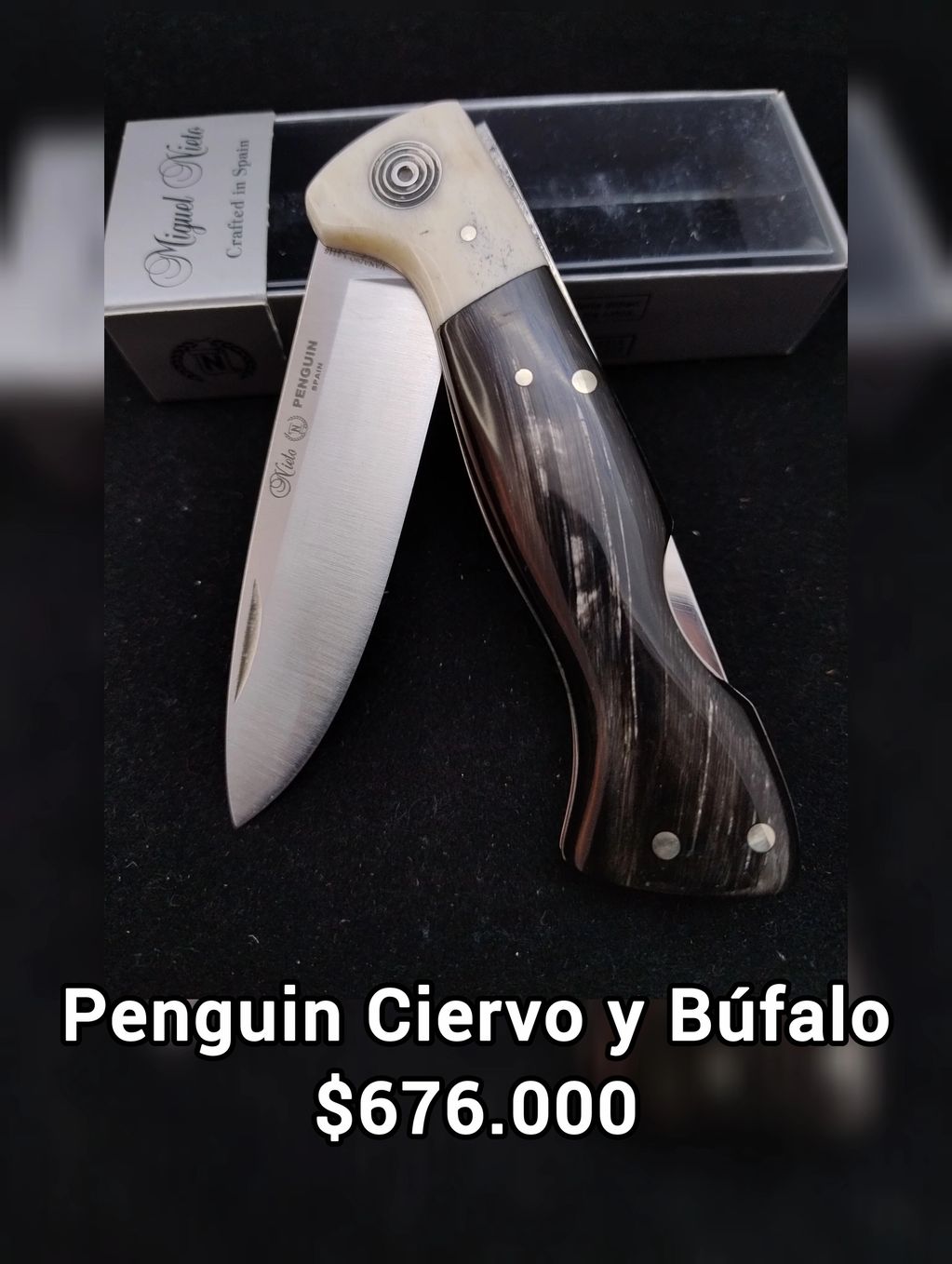 HojaAcero AN-58MangoAsta de búfaloTamaño hoja8 cmTamaño18,5 cmPeso100 grVirolaHueso de ciervoRemacheAcero inoxidable 303